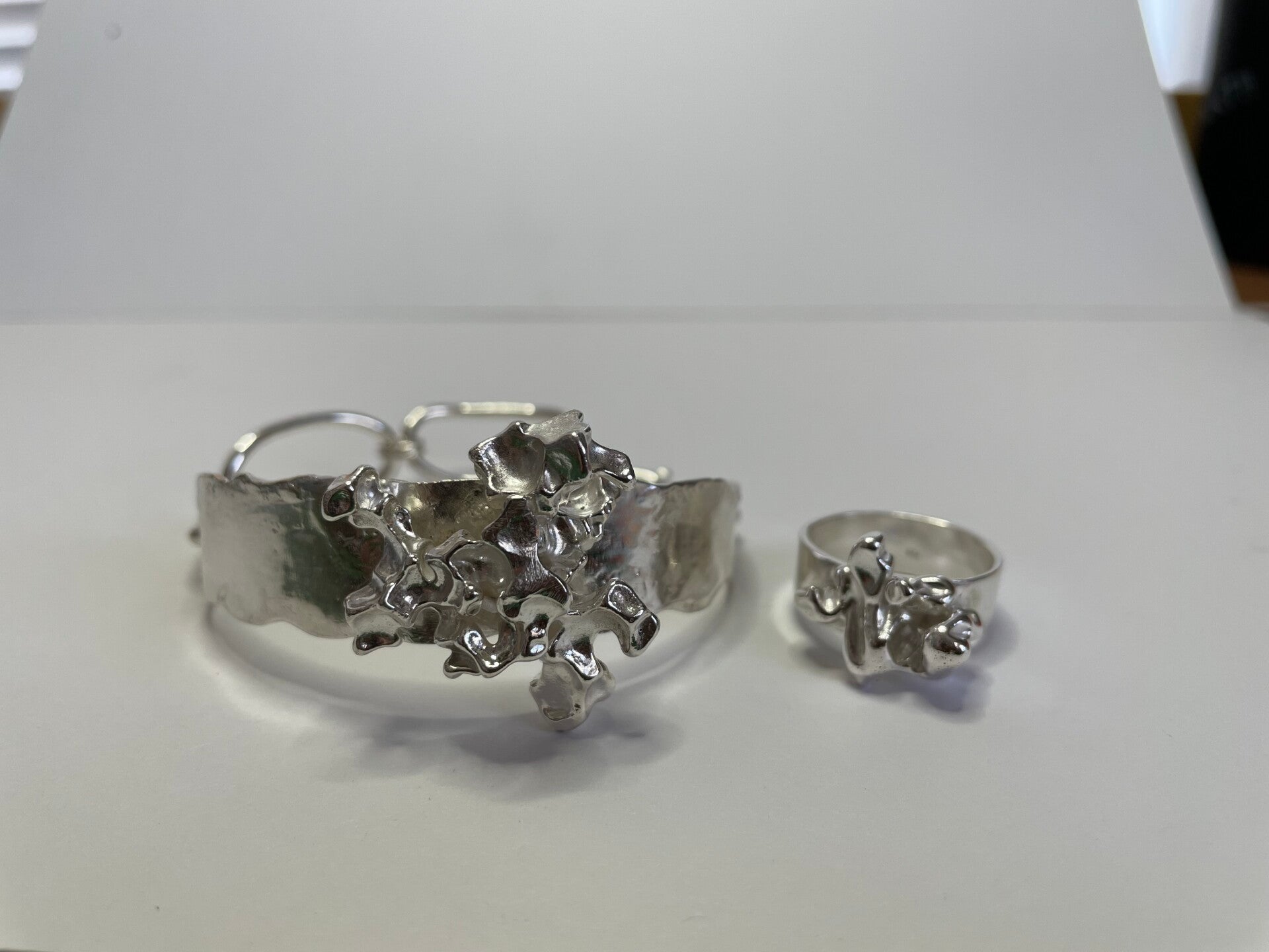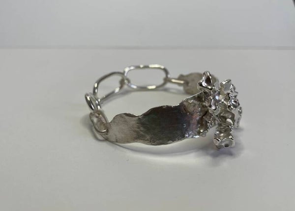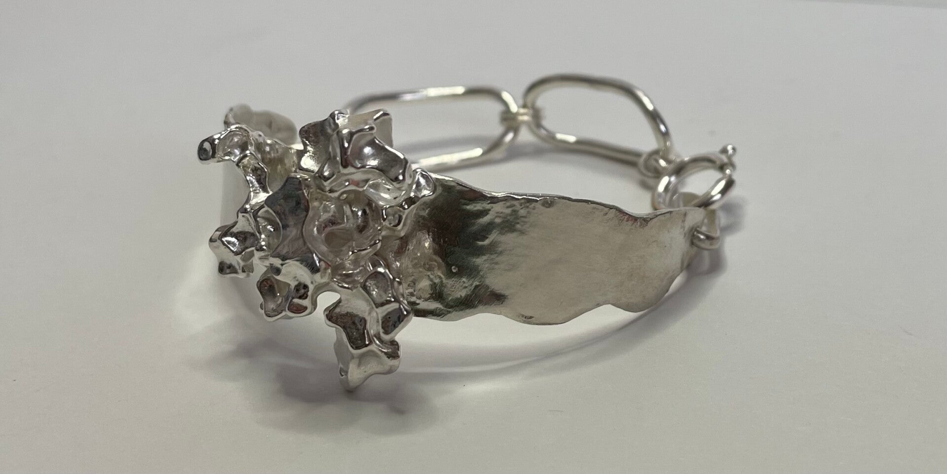 Deze zilveren armband is een echte blikvanger. Hij is uit dezelfde seie als de gegoten hangers. De breedte is 15 mm, gemeten op het breedste puntDe ring op de foto is verkocht.