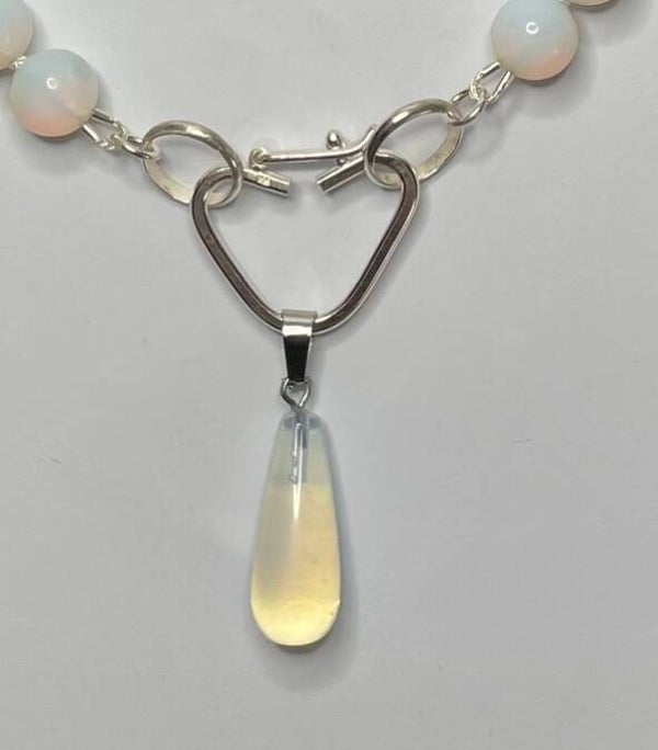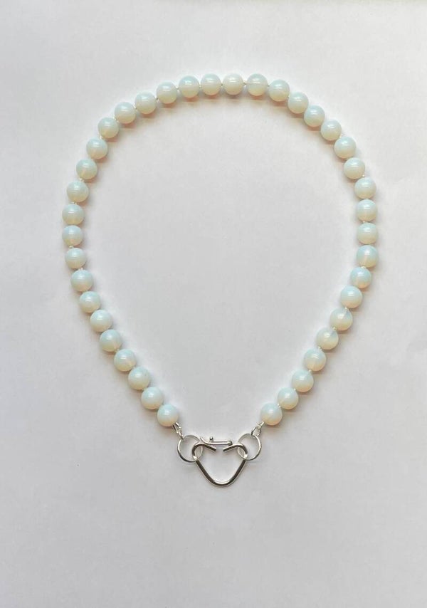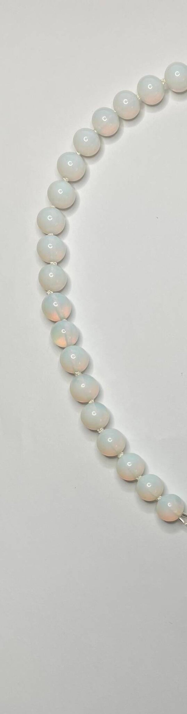 Bij dit collier zijn de opaliet kralen geknoopt met zijde, zoals dat bij parels gedaan wordt.