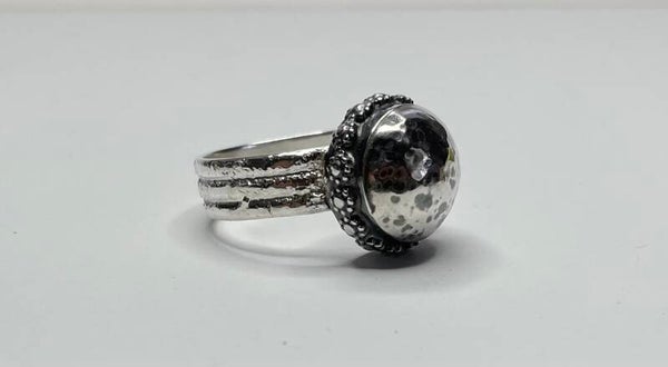 Deze zilveren ring heeft een ringband van 6mm, die bestaat uit 3 samengevoegde ringen, met een zandstructuur.