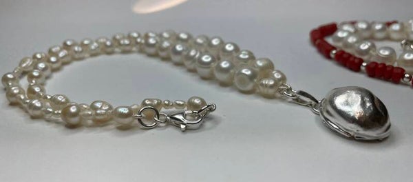 Dit lieve parelkettinkje is 43 cm. Ik heb 3 verschillende maten witte zoetwater parels gebruikt. Handgeknoopt op parelzijde.