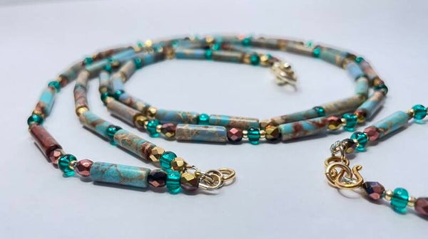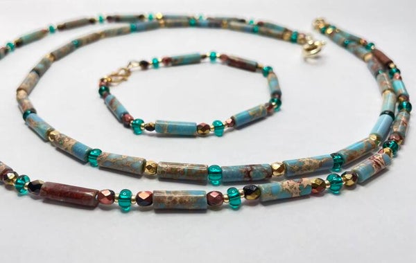 Jaspis turqoize tube kralen, geregen en geknoopt op parelzijde.