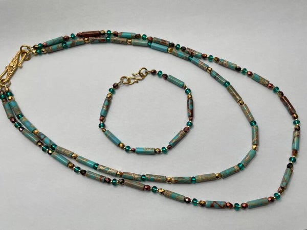 Gezellige armband met Jaspis turqoize tube kralen, geregen en geknoopt op parelzijde.