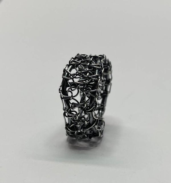 Deze zilveren ring, geknoopt met zilverdraad 0.4, maat 19, is geoxideerd (gezwart) en is variërend in breedte van 7.5-9.5 mm.